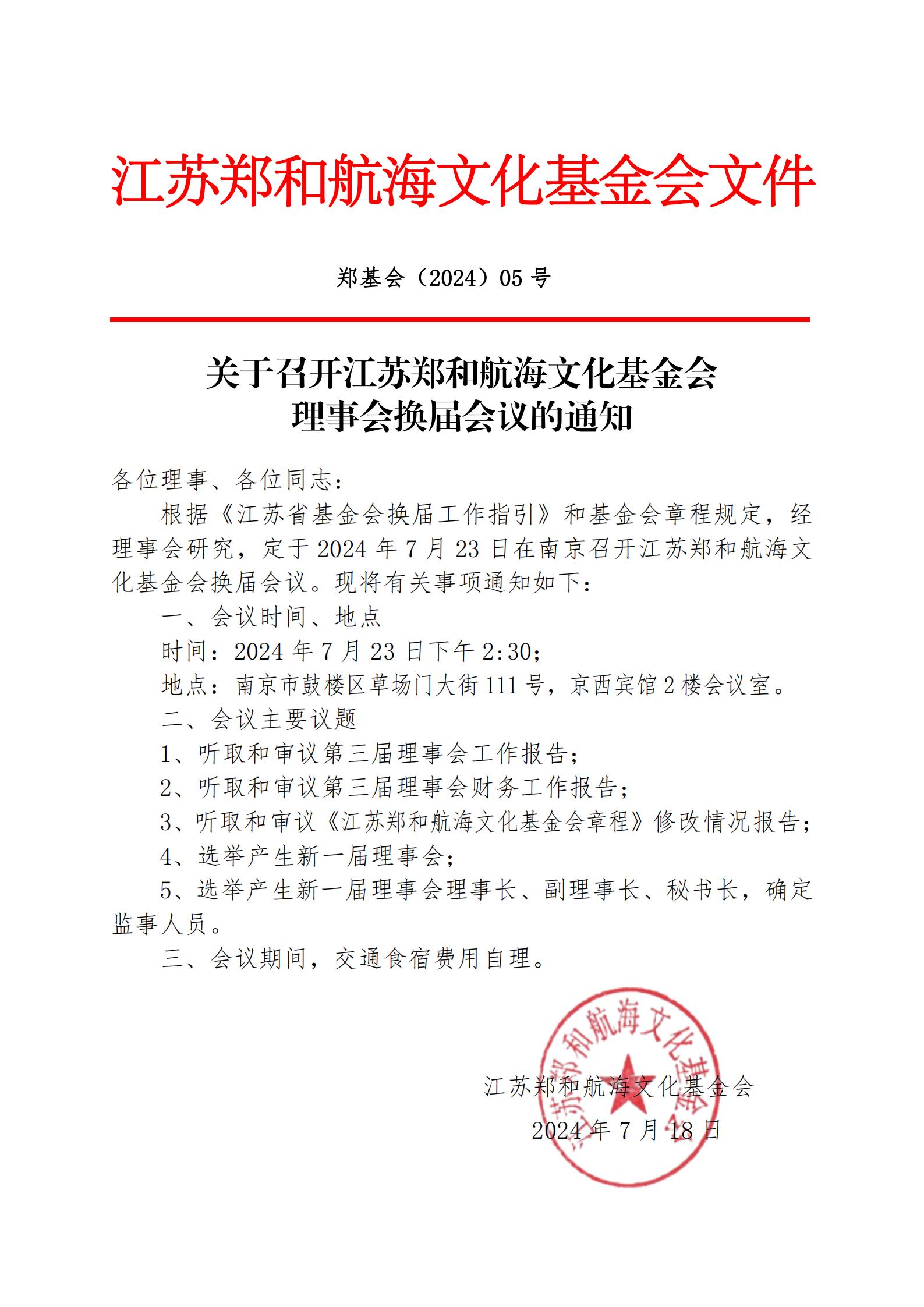 关于召开江苏郑和航海文化基金会理事会换届会议的通知